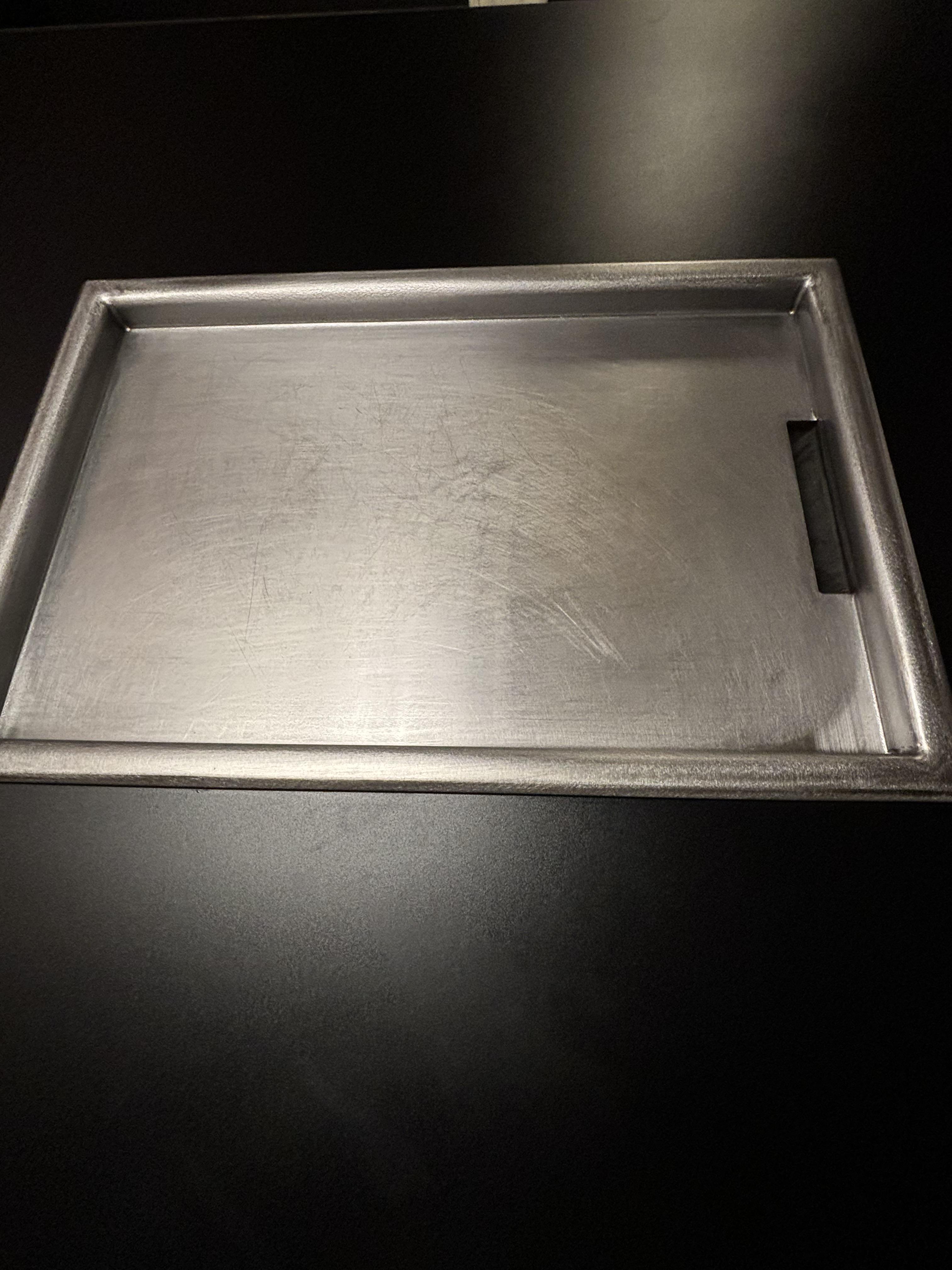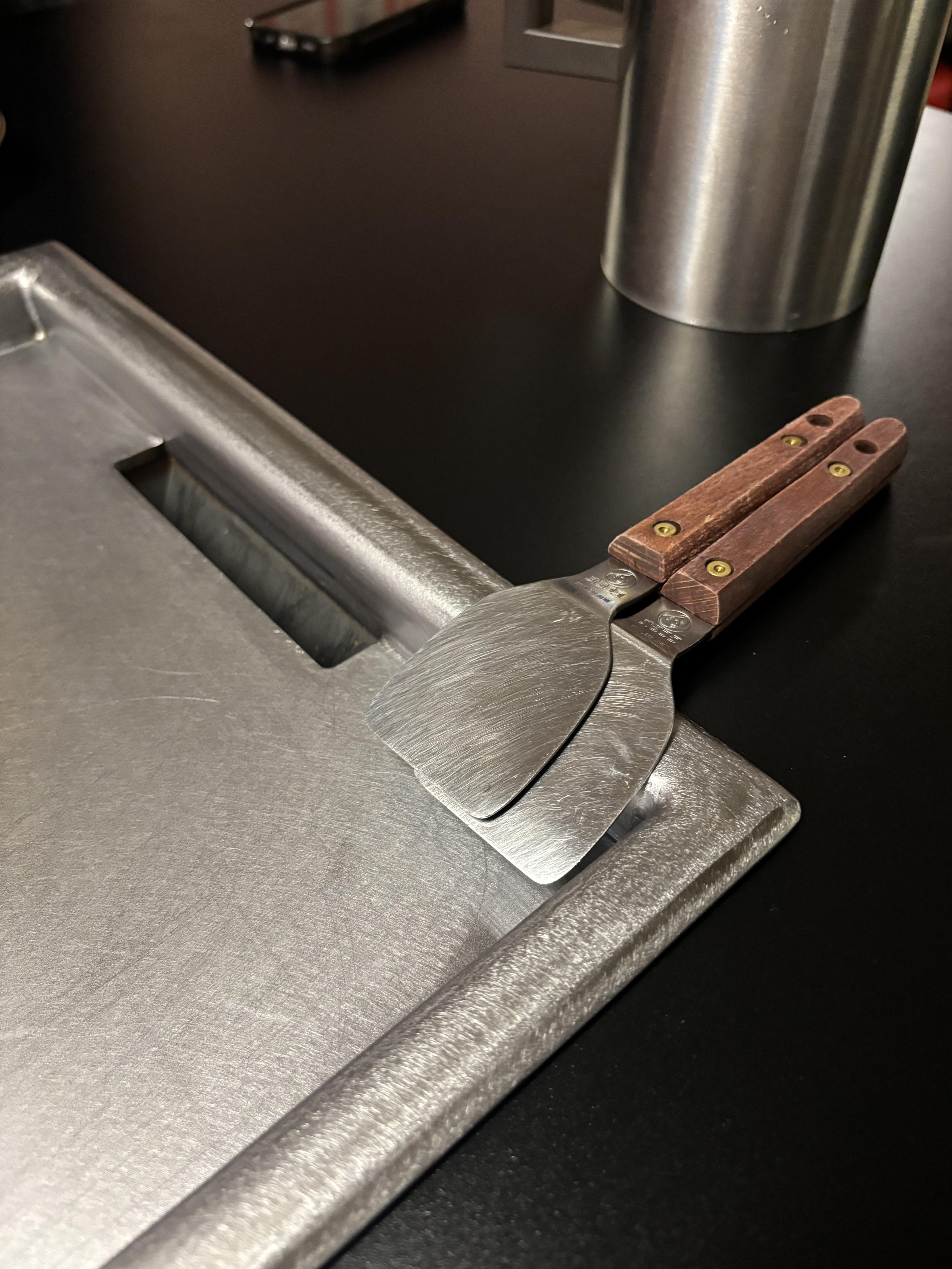 깔끔하게 정리된 철판에 작은 사이즈의 뒤집개도 미리 준비되어 있다.